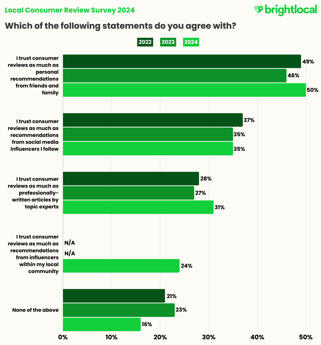 It is important to encourage satisfied patients to leave reviews and respond to all feedback, whether positive or negative. This enhances your online reputation and signals to Google that your dental clinic is active and reliable. A 2024 BrightLocal Consumer Review Survey found that 50% of individuals trust online reviews as much as a personal recommendation.